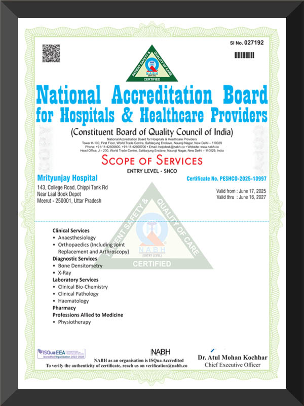 Mrityunjay Orthopedic Hospital (MOH) is proud to be accredited by the National Accreditation Board for Hospitals & Healthcare Providers (NABH) in 2025. This recognition reflects our dedication to the highest standards of patient safety, ethical practices, and quality healthcare delivery.